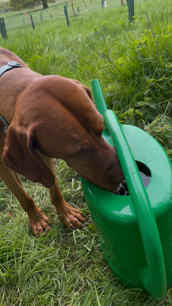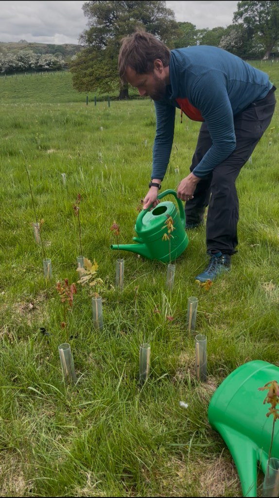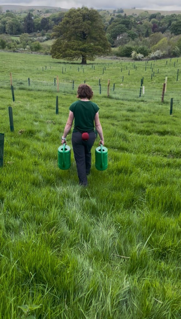 The solution has been many, many trips backwards and forwards over the ground carrying a 14 litre watering can in each hand. (Note: dogs are entirely unhelpful with this task – either drinking the water out of the can, or peeing on the saplings!). Watering 3,500 trees spread over 5 acres takes a long time so we’re doing a bit every day whilst keeping a keen eye on the met office weather forecast.
